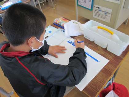 担任の先生がお手本となる作品を黒板に掲示すると、子ども達から「うわぁ、めっちゃきれい。」、「緑にしようか黄色にしようか迷うわ。」など、どんな作品をつくろうかとワクワクする声が聞こえてきました。