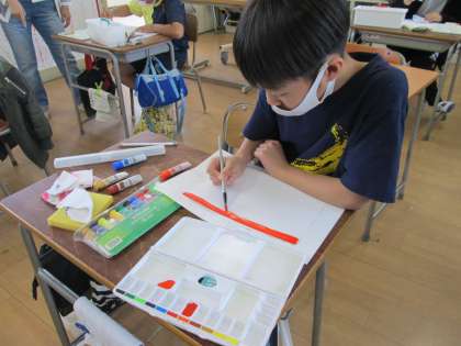 パレットを広げて自分の好きな色の絵の具を出し、画用紙に向かいます。子ども達は丁寧に、慎重に筆を動かして、一筋ずつ画用紙の上から色を塗っていきました。
