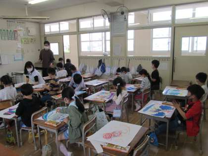大きくてカラフルなタマゴが真ん中でギザギザに割れて、中からいろいろなものが出てきます。画用紙に描かれたタマゴは魅力いっぱいで、子ども達は絵を指しながら楽しそうにお話をしてくれました。
