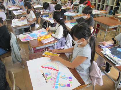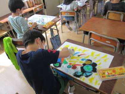 タマゴから生まれてくるのは、たくさんのお友達、動物やお魚、ロケットと星、などなど。自分が大好きなものが飛び出すように描かれたいました。