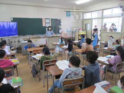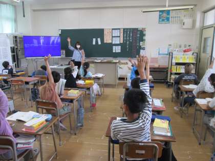 3年生の国語では、国語辞典でたくさんの言葉を並べるときのルールについて学習していました。並べ方のルールを確認してから、先生が出す言葉の順番について考えます。「ボール、ポール、ホールが出てくる順番を考えましょう」。
