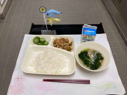 今日は「ホイコウロー、鶏肉と野菜の中華スープ、きゅうりのピリ辛あえ、ごはん、牛乳」でした。