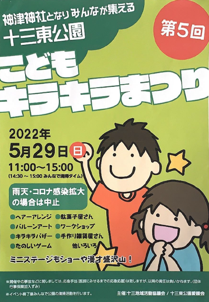 5月29日(日)に、十三東公園で「第5回こどもきらきらまつり」が開催されます。
