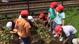 地域の方にサポートしていただきながら、「元気よく育て〜」と願いを込め、上手にさつまいの苗を植えることができました。