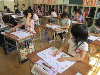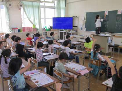 担任の先生が「“み”のつく言葉を集めましょう。」とたずねると、1年生の子ども達が手を挙げて発表します。「みつばち、です。」、「みのおのたき」、そして「みみ!」と自分の耳を引っ張っると教室が笑い声に包まれました。
