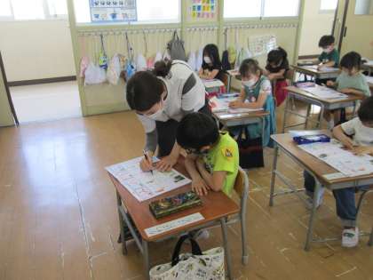 1年生の教室をのぞいてみると、国語でひらがなの練習をしていました。黒板に書かれたのは「の」と「み」。ひらがなの練習もだいぶん進んで、運筆が難しい字になってきたようです。