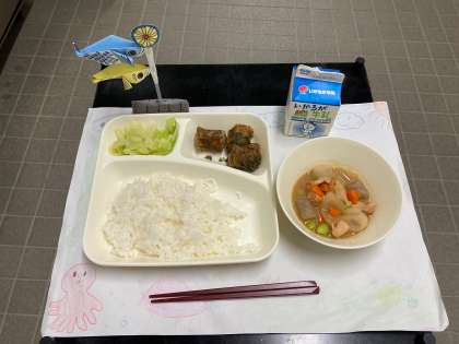 昨日は5月最後の給食で「ちくわのいそべあげ、あつあげとさといものみそ煮、あっさりキャベツ、ごはん、牛乳」でした。