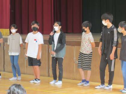 朝の児童集会で、児童会の担当の先生から「6月17日の金曜日に、なかよし集会をします。」という発表がありました。なかよし集会は全校児童で取り組む集会活動で、たてわり班ごとにゲームのお店を出すお祭りです。