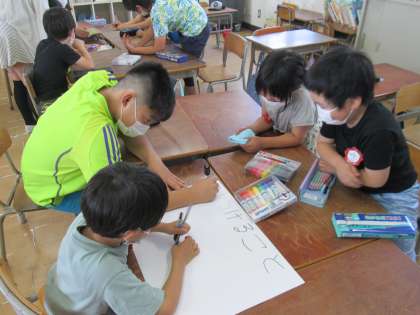 メンバーの役割が決まったら、次はお店の看板やルール説明を書いた紙を用意します。大きな画用紙を前に置き、みんなでアイデアを出し合います。「もっと字を大きく書かないと目立たへんで。」、「ここの色はもっとハデな色にしよう。」、「ここにボールの絵を描いたらええんちゃう」。