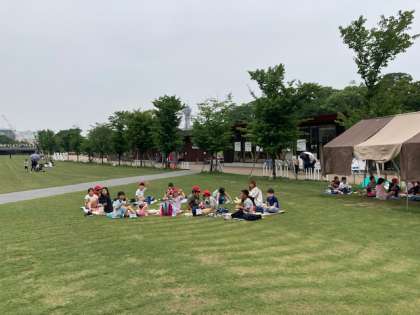 最上階からも見えた「てんしば」に降りてきて、お弁当を食べています。