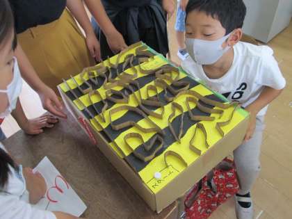 (上)3班 マグネットめいろ(下でマグネットを操作してゴールを目指します。)