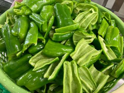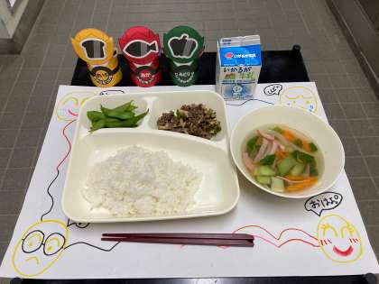 今日は「チンジャオニューロウスー、ハムと野菜の中華スープ、えだまめ、ごはん、牛乳」でした。