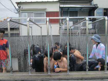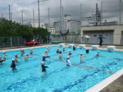 運動場で準備運動をした後、一年ぶりのプールのシャワーを浴びて体をきれいにします。今週に入ってから気温も高くなり、蒸し暑くなってきたので冷たいシャワーが気持ちいいです。子ども達は「きゃあ、きゃあ」とはしゃいでいました。