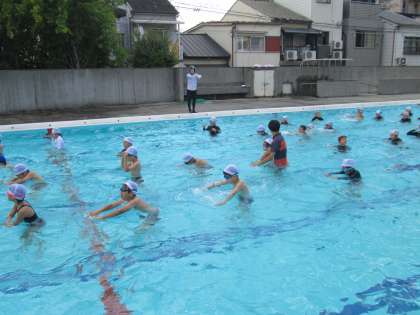 プールに入って4列に並び、音楽に合わせて水慣れの運動をします。水の中で手を回したり、足を蹴り上げたり、パシャパシャと水をかけあったり、いろいろな動きをして水慣れをしました。