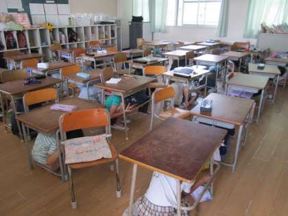 2限目、突然ジリジリジリジリと非常ベルが鳴り、「地震が発生しました。」という校内放送が流れました。子ども達はすぐに机の下にもぐって、頭と体を守りました。地震の揺れがおさまるのを待って、校内放送の指示を聞いてクラスでまとまって運動場に避難します。