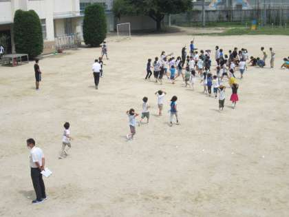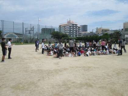 運動場ではクラスごとにまとまって座り、担任の先生が学級の人数と児童のケガの有無を確認しました。