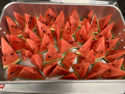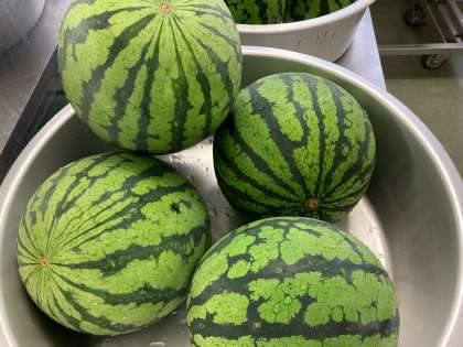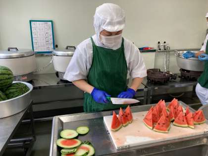 今日は「パエリア、ウインナーとキャベツのスープ、すいか、黒糖パン、牛乳」でした。パエリアには、赤ピーマンを使用し、カレー風味で人気がありました。年に一度のすいかは1玉を64人分に切り分け甘い部分がみんなに当たるように切りました。みんなよく食べていました。