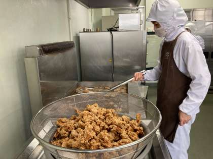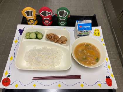 今日は「豚肉のたつたあげ、みそ汁、きゅうりの甘酢づけ、ごはん、牛乳」でした。豚肉のたつたあげは、カラッと揚がり香ばしく、人気がありました。みそ汁には、かぼちゃ、オクラの夏野菜が入り、夏を感じる汁ものでした。きゅうりはシャキシャキとした食感もよくあっさりとして、暑い夏によく合うおかずでした。