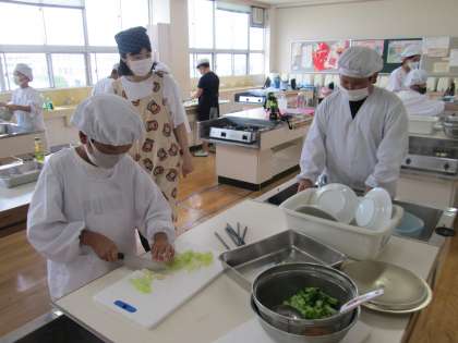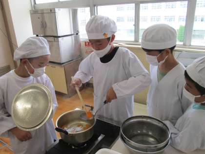 5年生の子ども達が家庭科の調理実習をしました。メニューは人参とキャベツとブロッコリーを茹でてつくる、『カラフルゆで野菜サラダ』です。