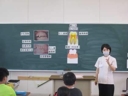 健康な状態に保たれている歯と、歯周病になっている歯の写真を黒板に並べて掲示し、歯の健康状態を調べるポイントを学習しました。「歯の色や表面の様子、歯茎の色や形を見ましょう。健康な歯は歯茎が引き締まっていますが、歯周病になっている歯は歯茎が腫れています」。お家に帰ってから自分の歯を鏡で見て、健康な歯の写真と見比べて健康状態をチェックするという宿題も出されました。