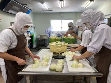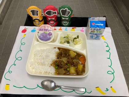 今日は「ビーフカレーライス(米粉)、野菜のピクルス、ぶどうゼリー、牛乳」でした。今日のビーフカレーライスはいつもの小麦粉で作られているカレールウではなく、米粉から作られているカレールウを使用しました。小麦アレルギーの児童も食べられるカレーライスでした。ピクルスは、さっぱりとして、カレーライスによく合いました。デザートのぶどうゼリーは、甘酸っぱくて児童にも人気がありました。