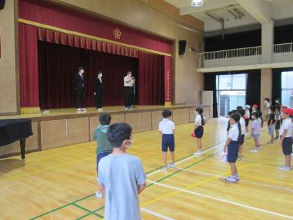 児童集会では9月の一ヶ月の間、十三小学校で教育実習を行う2名の先生の紹介が、校長先生からありました。「これから一ヶ月、先生になるための勉強をいっぱいします。十三小学校のみなさんと一緒に、たくさん学習をしたり遊んだりしたいと思っています。どんどん声をかけてくださいね」。