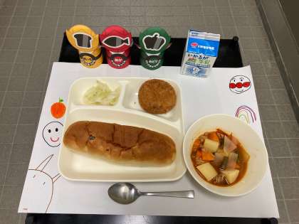今日は「チキンレバーカツ、ケチャップ煮、キャベツのバジル風味サラダ、おさつパン、牛乳」でした。