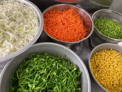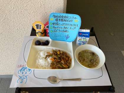 今日は学校給食献立コンクール優秀賞献立でした。「野菜たっぷりカラフルライス、キャベツときのこのスープ、ぶどう(巨峰)、牛乳」でした。野菜たっぷりカラフルライスは色とりどりの野菜が使われ、ケチャップ、ウスターソースなどで味をつけました。スープは、えのき、しめじが入ったあっさりとしたスープでした。ぶどうは長野県産で、種なしの甘いぶどうでした。