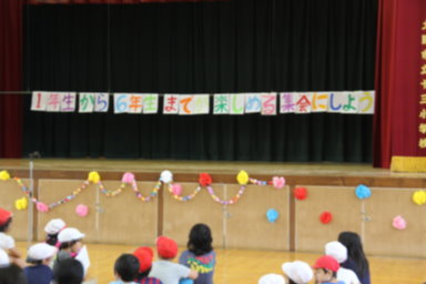 <写真上>今年の目標「1年生から6年生までが楽しめる集会にしよう」