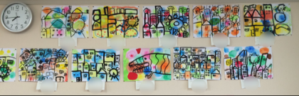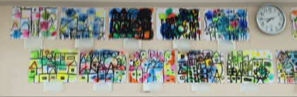 絵の具と水を使って、にじませたり、ぼかしたりしたものを背景に、夜の町を描く子や恐竜をイメージする子がいました。(恐竜は一人だけでしたが・・・)
