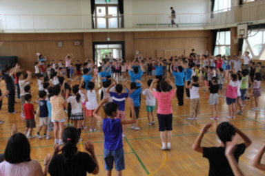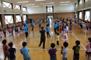 地域の民謡踊りの先生に来ていただいて、「淀川音頭」と「ドンパン節」を全校みんなで踊りました。1年生の子ども達は、初めてでしたが、見よう見まねで一生懸命に踊っていました。子ども達は、どんどん熱中してきて、「ええとこだっせ!」「よいしょ!」と、講堂に響き渡る声を出して楽しんでいました。見に来ていただいた保護者の方々からはうちわであおいでいただく応援もありました。