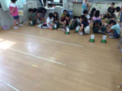 帆をつけた車に送風機を向けスイッチオン!「いけー!」といいながら子ども達は楽しんで実験をしていました。