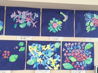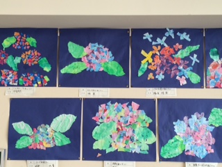 日ごとに色が変化していくあじさいの花を表現してみました。色とりどりのあじさいが、教室いっぱいに咲き乱れています。