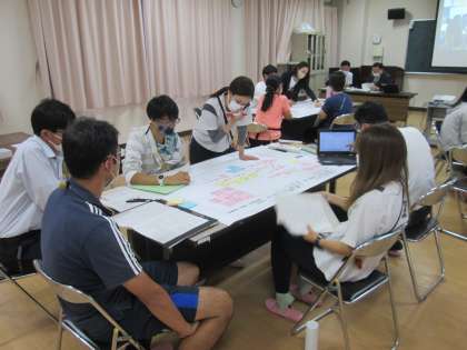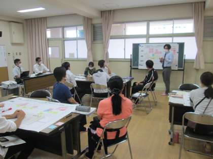 研究討議会の前半には授業者のふりかえりや、参観した教職員のグループ討議を行いました。学習者用端末を使った話し合い活動や、登場人物の心情を整理するために工夫された板書、児童が主発問について深く考えるためのワークシートなど、今回の授業で良かった点が多数あげられました。また、ICT機器の活用の仕方やさらなる改善点についても様々なアイデアが出されました。
