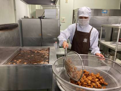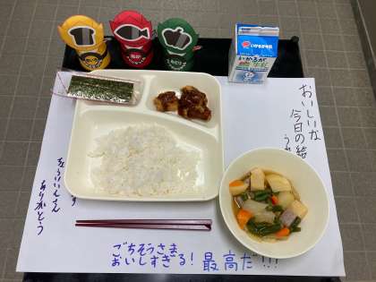 今日は「みそカツ、じゃがいもと野菜の煮もの、焼きのり、ごはん、牛乳」でした。手作りの一口トンカツに八丁味噌などを使用したみそソースをかけました。香ばしいトンカツとみそソースがよく合いました。