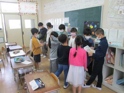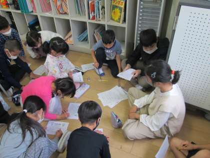 来週には子ども達が楽しみにしている「なかよし遠足」があります。万博公園の中をたてわり班でオリエンテーリングをして回ったり、お昼ご飯をいっしょに食べたりします。今日の2限目はその準備のため、たてわり班活動を行いました。