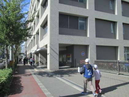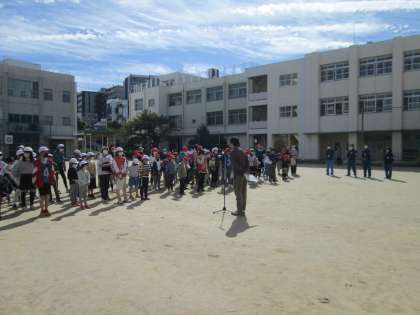 1限目の終わりを告げるチャイムが鳴ると、子ども達が赤白帽をかぶって運動場に降りてきました。たてわり班で十三の町を歩く、「交通安全指導」の学習です。