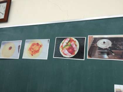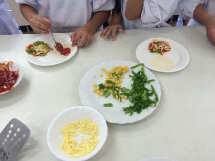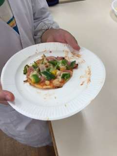 1年生が育てたミニトマト(アイコ)と2年生が育てたピーマンをそれぞれ分け合って、ピザの具にしました。