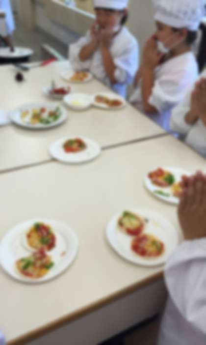 ピザを焼くときは、1年生はホットプレートで、2年生はフライパンで焼きました。