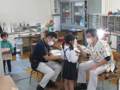 受付をすませると玄関に近い保健室から健康診断スタートです。1階にある部屋を順番に回って、内科や歯科の学校医の先生に診てもらったり、視力や聴力の検査をしたりしました。