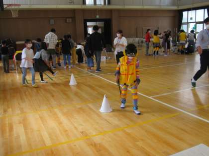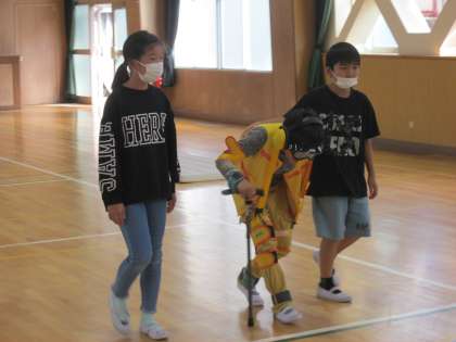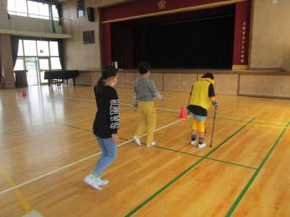 いろいろな装具を身に着けて高齢者に変身した子ども達は、福祉協議会の方が用意してくださったコースを歩きます。