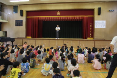 大阪市歌を歌った後、校長よりいくつかお話をしました。「思い切り夏休みをすごし、一生懸命に何かに『ひたって』ほしい。夢中になって取り組んでほしい。ただし、テレビやゲーム、ケイタイは、お家の人とよく相談してほしい」ということ。また、「十三五か条の心得」についてのお話もありました。