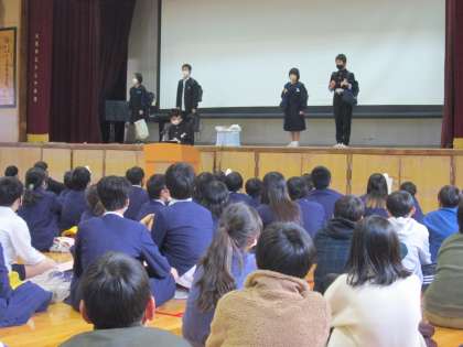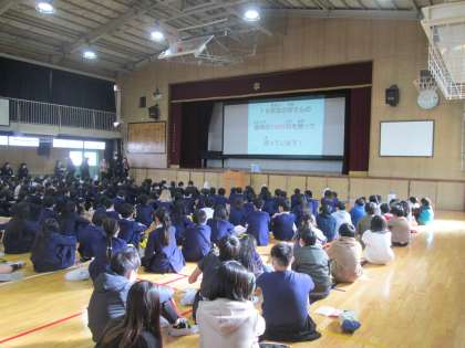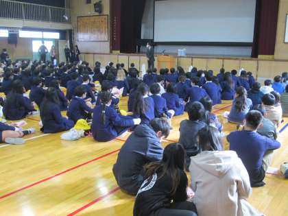 5つの小学校の在籍児童を足すと167名。まずは講堂に入り、中学校の校長先生のお話を聞いたり、生徒会による学校紹介のプレゼンテーションを鑑賞したりしました。