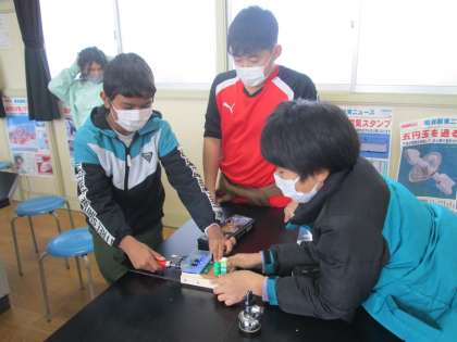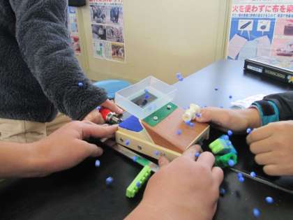 プレート境界型地震が発生する仕組みについて復習してから、モデルになる装置を使って地震を起こす実験をしました。