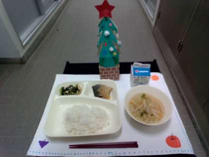 今日は「さばのみぞれかけ、すまし汁、こまつなの煮びたし、ごはん、牛乳」でした。さばのみぞれかけはゆずが入っただいこんおろしを焼いたさばにかけて食べます。だいこんおろしを好む児童が多く、「だいこんおろしをごはんにかけて食べたい!」「このだいこんおろしだけのメニューを出してほしい」というくらい人気がありました。それと、具だくさんのすまし汁と栄養満点のこまつなの煮びたしの組み合わせでした。