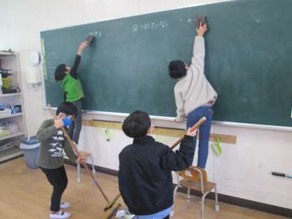 ガタゴトガタゴトとがんばって机とイスを廊下に運んで、教室の中は空っぽ。ほうきでゴミを集めて、ぞうきんで拭いてピカピカにしました。気持ちよく新しい年を迎えられますね。