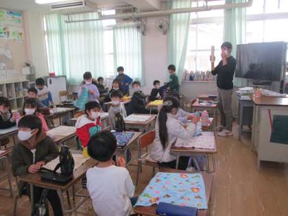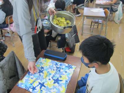 2年生の教室では子ども達がワクワクした様子で、テーブルの準備をしていました。先生が一人ずうの机の上にラップを敷いて、その上に蒸かしたサツマイモを置いていきます。
