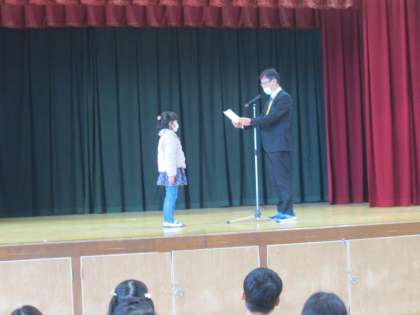 また、お話に続けて読書名人の表彰が行われました。鄭学園の目標80冊を達成した2年生の女の子が舞台に上がり、校長先生から『読書名人認定証』が授与されました。