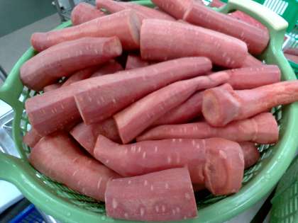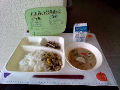 今日は「きんぴらちらし、ぞう煮、ごまめ、牛乳」でした。きんぴらちらしは、豚肉、ごぼう、グリンピース、コーンを使い、いろどりもよく食べやすいちらしずしでした。ぞう煮は、白玉もち、金時にんじん、さといも、だいこん、三つ葉を使った白みそを多く使った汁ものでした。ごまめはパリッと焼き上げて甘辛いたれでからめ、好評な一品でした。