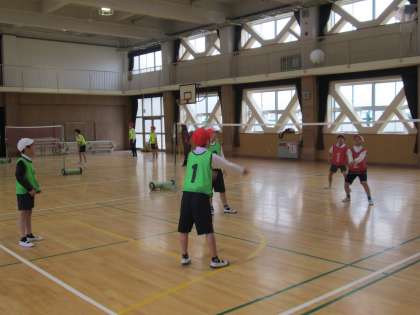 5年生が体育の授業でソフトバレーボールに取り組んでいます。フワフワで大きめのボールを使うので、突き指などのけがをする心配がありません。